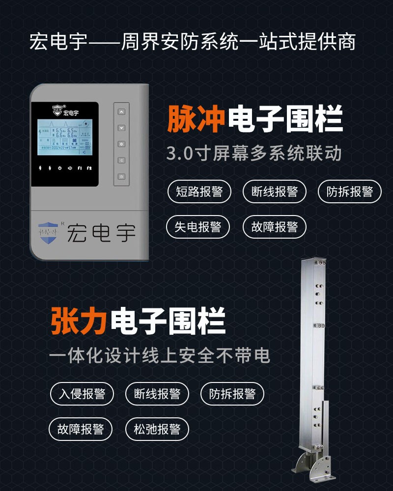 成都宏电宇科技有限公司成立于2012年,注册资金4800万,公司拥有:产品检验报告、ISO9001认证、3A认证、中国节能环保认证, 公司专业从事周界报警系统整体解决方案提供商,主营:脉冲电子围栏、生物感应电子围栏、张力电子围栏、振动光纤、激光对射、红外对射、双鉴探测器、烟雾报警器、玻璃破碎探测器、温湿度传感器、水浸探测器、一键报警、防爆探测器、巡更、刀刺网、护栏网、升降柱、门禁 等,专业致力于周界防范系统电子围栏的研发、生产、销售和安装。多年的经营和对用户的关怀,我们已经形成集研发、生产、销售、工程安装于一体的高新科技安防公司。